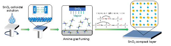 1. This work proposes a base-catalyzed densification mechanism to promote the SnO2 colloidal converted into compact film through particle connections and attachments facilitated by basic amine gas treatments.