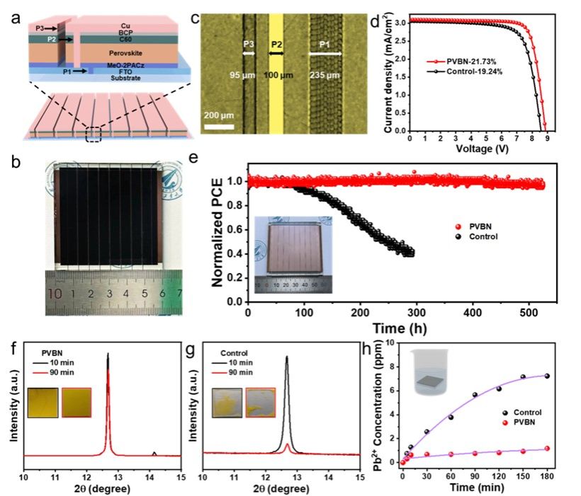 图4. (a)36cm2反式钙钛矿模组结构示意图。(b)模组实物图。(c)激光划刻刻蚀线(P1-P3)图片。(d)PVBN修饰前后模组的J-V曲线。(e)PVBN处理前后封装组件的工作稳定性。(f,g)PVBN处理前后钙钛矿薄膜在水中浸泡10分钟和90分钟的XRD图谱。(h)PVBN处理前后钙钛矿薄膜在水中浸泡不同时间的铅泄露浓度记录。