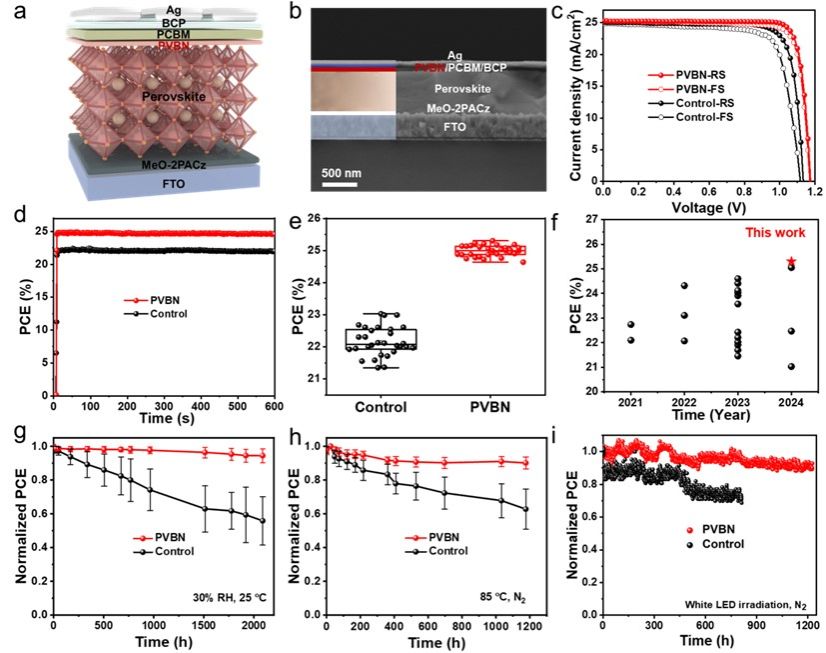 图2. (a)反式钙钛矿太阳能电池器件结构示意图。(b)PVBN处理的器件截面SEM图像。(c)PVBN处理前后器件的冠军效率J-V曲线比较。(d)PVBN处理前后器件的600s稳态输出比较。(e)PVBN处理前后器件的30块独立电池PCE的统计分布。(f)近年来关于聚合物修饰反式钙钛矿太阳能电池的PCE总结。PVBN处理前后器件的(g)储存稳定性对比、(h)热稳定性对比、(i)工作稳定性对比。