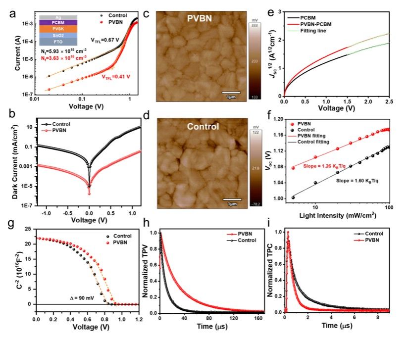 图3. (a)PVBN处理前后纯电子型器件的SCLC测试。(b)PVBN处理前后器件的暗态J-V曲线。(c,d)PVBN处理前后钙钛矿薄膜表面的电势分布。(e)PCBM与PVBN/PCBM的电子迁移率测试。PVBN处理前后器件的(f)Voc-Light关系、(g)Mott-Schottky曲线、(h)瞬态光电压测试、(i)瞬态光电流测试。