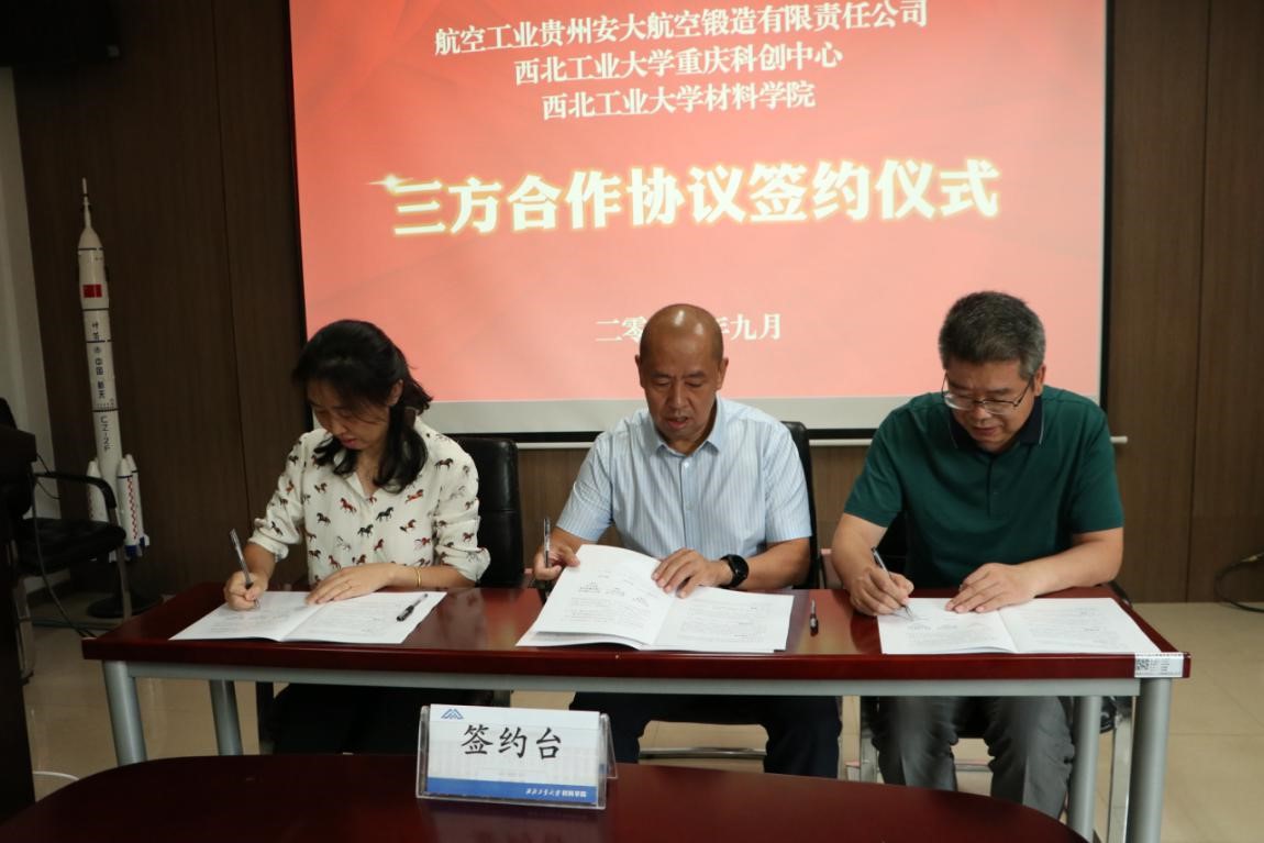 9月29日,yl8858永利集团与贵州安大航空锻造有限责任公司(以下简称“贵州安大”)、重庆科创中心三方合作协议签约仪式在西工大友谊校区公字楼会议室成功举行。贵州安大党委书记、董事长冀胜利、yl8858永利集团院长李金山、重庆科创中心主任助理杨艳慧出席并签署协议。贵州安大副总经理叶俊青、狄鹏及各部门负责人、yl8858永利集团领导班子及教师代表出席签约仪式,yl8858永利集团党委副书记(主持工作)李恒主持签约仪式。