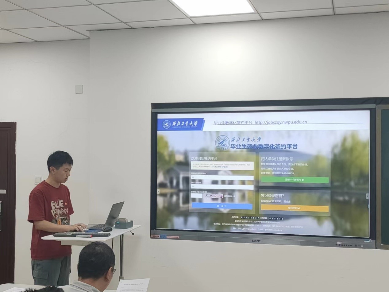 随后,王子健同学介绍了毕业生就业数字化签约平台的使用方法和注意事项,并结合学校《关于启动2023届毕业生网络签约工作的通知》要求,强调了各个时间节点前应该完成的重要操作步骤,并对提交电子协议书、确认签约环节、违约处理流程等进行了重点介绍。
