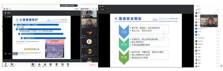 刘伟首先对即将到来的线上课程学习进行了动员,一方面提醒同学们要具备集体意识,建立愉快和谐宿舍学习环境;另一方面呼吁同学们要遵守网络公约,营造积极健康在线学习氛围。随后,王永欣从课前准备、课程补选、线上学习规范、突发情况应对等几方面对同学们进行了指导,强调要秉持优良学风和乐观态度,完成好特殊时期的在线学习任务,同时对上课过程中可能遇到的核酸检测工作以及购餐工作的灵活应对提出了建议。