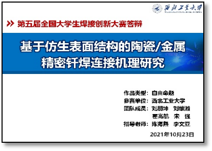 2021年10月20日-23日第五届全国大学生焊接创新大赛决赛在哈尔滨工业大学举行,本次大赛共有来自哈尔滨工业大学、天津大学、yl88858永利中国、清华大学、上海交通大学、东南大学等高校148组作品参加,本次比赛采用线下作品性能测试与线上作品答辩相结合的形式进行。经过激烈的比赛,yl8858永利集团学生刘朋坤、霍高航、宋强、刘维瀚共同完成的作品《基于仿生表面结构的陶瓷/金属精密钎焊连接机理研究》荣获比赛一等奖,作品指导教师为陈海燕副教授和李文亚教授,李京龙教授、张勇副教授也为作品提供了细心指导和帮助。