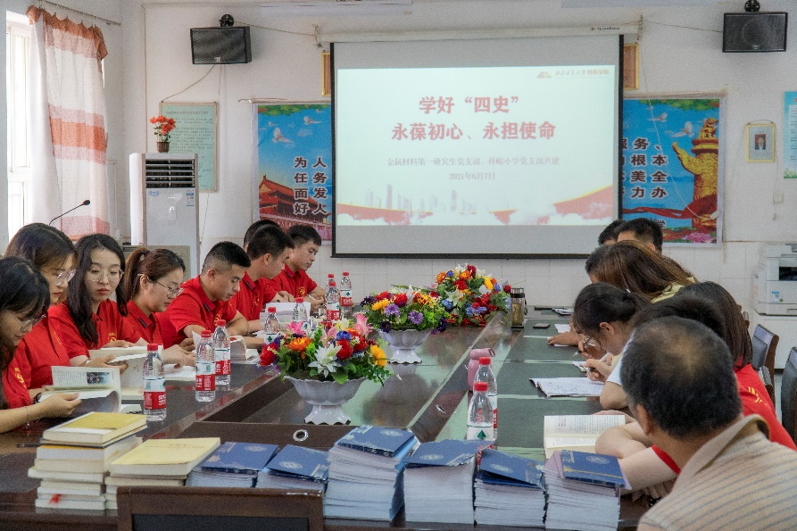 宣讲开始前,党支部一行人同祥峪小学教师党员集中学习了《学好“四史”,永葆初心,永担使命》和《中国共产党简史》部分内容,并就本职工作和学习体会展开深入研讨。祥峪小学校长王天宇对党支部的到来表示热烈地欢迎,分别就学校办学、生源以及日常党史学习教育等情况同大家一起交流。金属材料第一研究生党支部副书记马凤强介绍了支部基本情况,表示要以推动党建与学习科研为落脚点,严格对标看齐,努力争创先进,通过创新宣讲形式,将党史学习教育融入到日常学习生活中,努力办好每次进校宣讲活动。