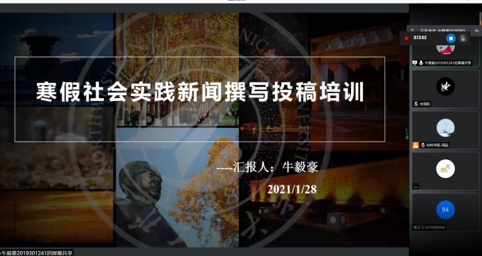 1月28日晚,yl8858永利集团利用腾讯会议召开2021年寒假社会实践启动仪式暨投稿相关注意事项培训会。yl8858永利集团党委副书记刘伟,团委书记李治军及全体社会实践报名学生参加,会议由yl8858永利集团学生会青年社会实践中心主任周喆主持。