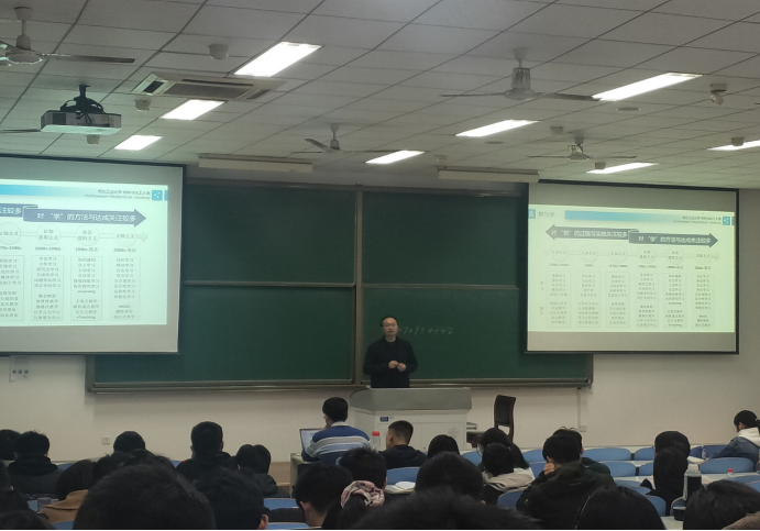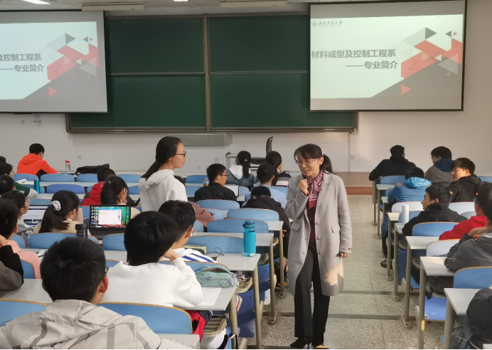 罗皎教授首先就材料成型及控制工程专业对同学们进行了简单的提问,询问同学们对这个专业的认识。紧接着,罗老师就专业概况、师资队伍、研究背景与研究方向、创新成果、平台建设与科学研究五个方面对同学们进行了详细的讲解。最后罗老师就同学们感兴趣的有关未来发展方向、就业领域等问题一一做了解答。