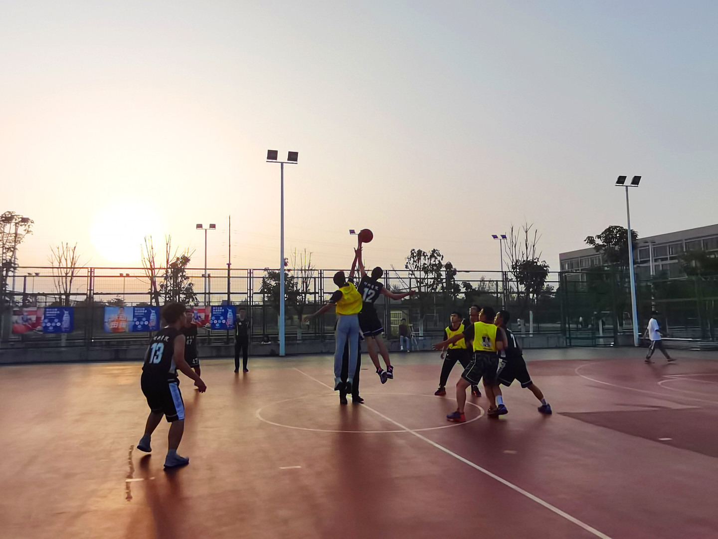 下午5:40,球员们已经到场做准备活动了,一个一个满怀激动期待比赛开始。随着裁判的哨响,开球手高高跳起,飞争篮球,给开场留下了一个最帅气的剪影。