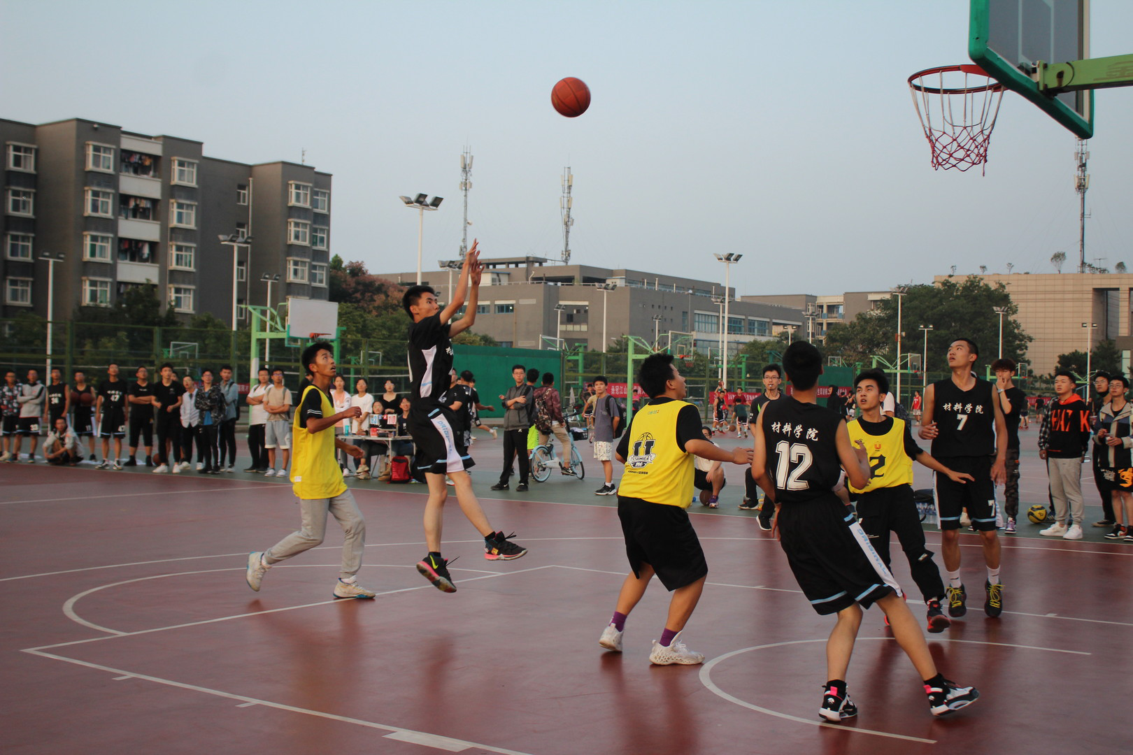 比赛进程中,双方队员都全力以赴,积极防守,奋力进攻,越战越勇。球员们带球、运球、投篮一系列动作潇洒帅气,引来了围观同学一阵阵喝彩,场面十分火热。
