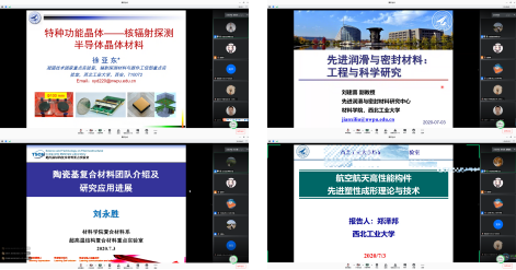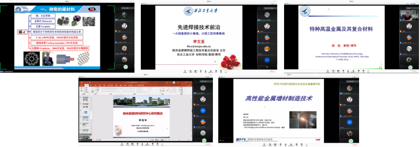 本次暑期学校共安排九场学术讲座,付前刚教授、李文亚教授、胡锐教授、李炫华教授、杨海欧副研究员、徐亚东教授、刘建喜副教授、刘永胜教授和郑泽邦教授分别围绕“高性能低成本碳碳复合材料”“先进焊接技术前沿”“特种高温金属及其复合材料”“纳米能源材料”“高性能金属材料的增材制造”“特种功能晶体——核辐射探测半导体晶体材料”“先进润滑与密封材料工程与科学研究”“陶瓷基复合材料团队介绍及研究进展和航空航天高性能构件先进塑型成形理论与技术”等题目展开了内容丰富的宣讲,师生双方通过屏幕进行了精彩热烈的讨论,学生们收获颇丰。