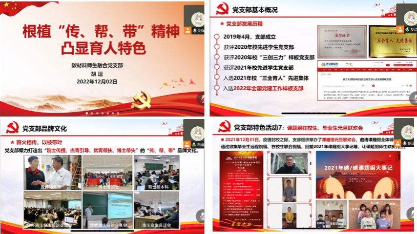 会议第三项,西工大碳材料师生融合党支部副书记胡逗以“根植‘传、帮、带’精神凸显育人特色”为主题介绍支部建设和特色活动。自支部成立以来,支部党员一直以“扎根西北、建设国防”为己任,党支部倾力打造“院士传授、杰青引导、优青帮扶、博士带头”的“传帮带”品牌文化,打好三会一课基础,体会科研团队三十年发展历程。支部坚持组织开展博士牵手本科生、研究生系列活动,助力本科生、研究生加强专业认知。