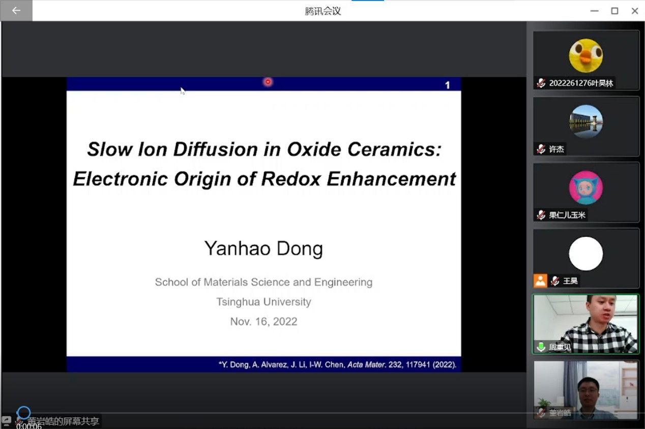 2022年11月16日下午,yl8858永利集团材创“0-1”青年学术论坛邀请清华大学yl8858永利集团董岩皓教授材在公字楼328为学院师生作了 “氧化还原反应加快的氧化物陶瓷慢离子动力学”为主题的精彩报告。周重见教授主持了报告会。董岩皓担任清华大学yl8858永利集团助理教授,博士生导师,研究方向为结构陶瓷和能源陶瓷材料。2012年本科毕业于清华大学材料科学与工程系。2012至2017年,在美国宾夕法尼亚大学学习,获材料学硕士、应用力学硕士和材料学博士学位,从事陶瓷材料烧结、扩散、微结构演化等基础理论的研究。2017至2022年,在美国麻省理工学院从事博士后研究,从事交叉学科材料设计、制备、微结构、衰减机理的研究。曾获得美国陶瓷学会颁发的Early Discovery Award、Edward C. Henry Award和优秀博士生论文奖,Acta Materialia期刊ActStudent Award,宾夕法尼亚大学Sidney J. Stein Prize等一系列荣誉。以通讯作者、第一作者身份在NatureNat. Energy、Acta Mater.、J. Am. Ceram. Soc.等学术期刊发表论文30余篇。