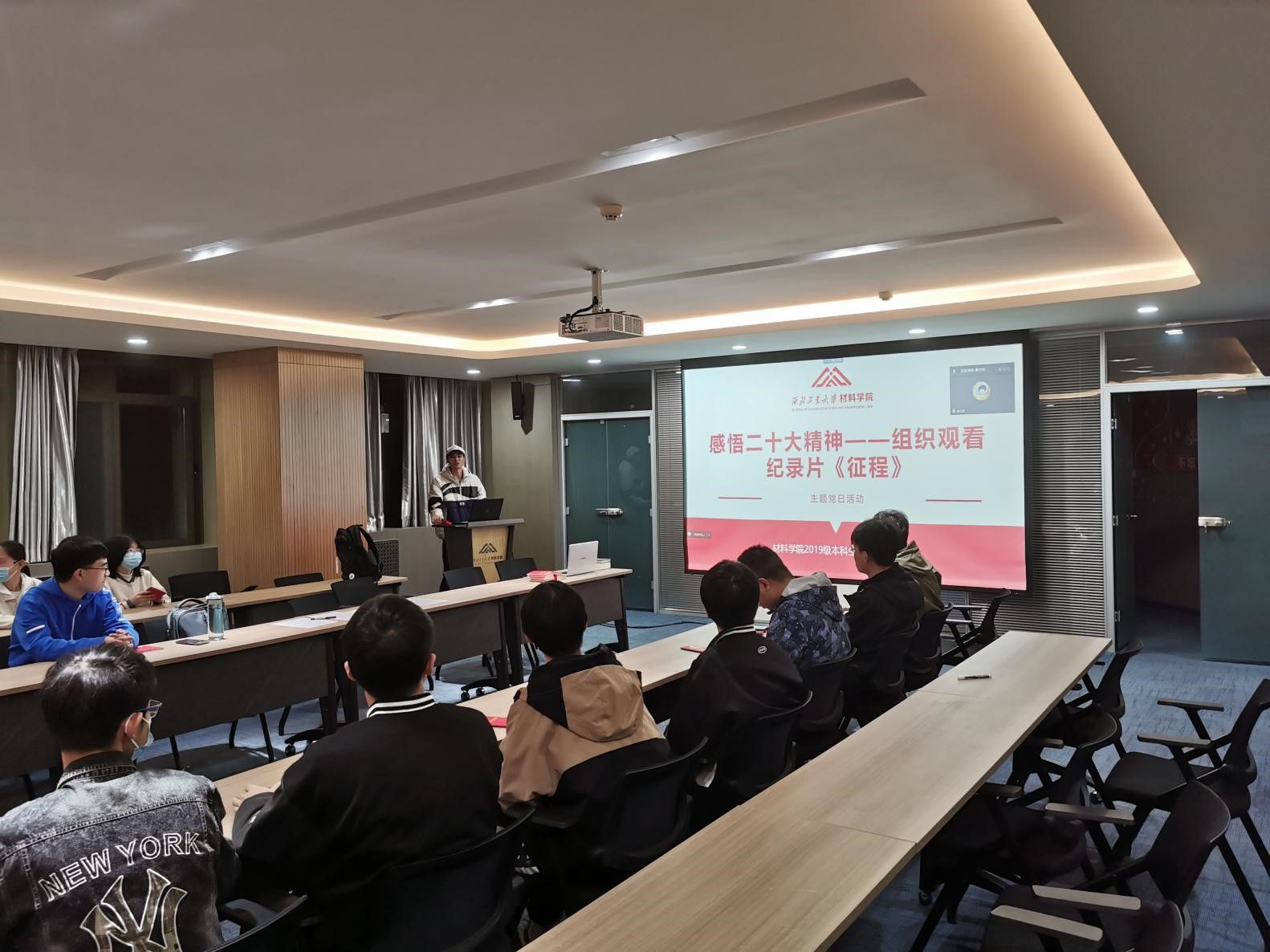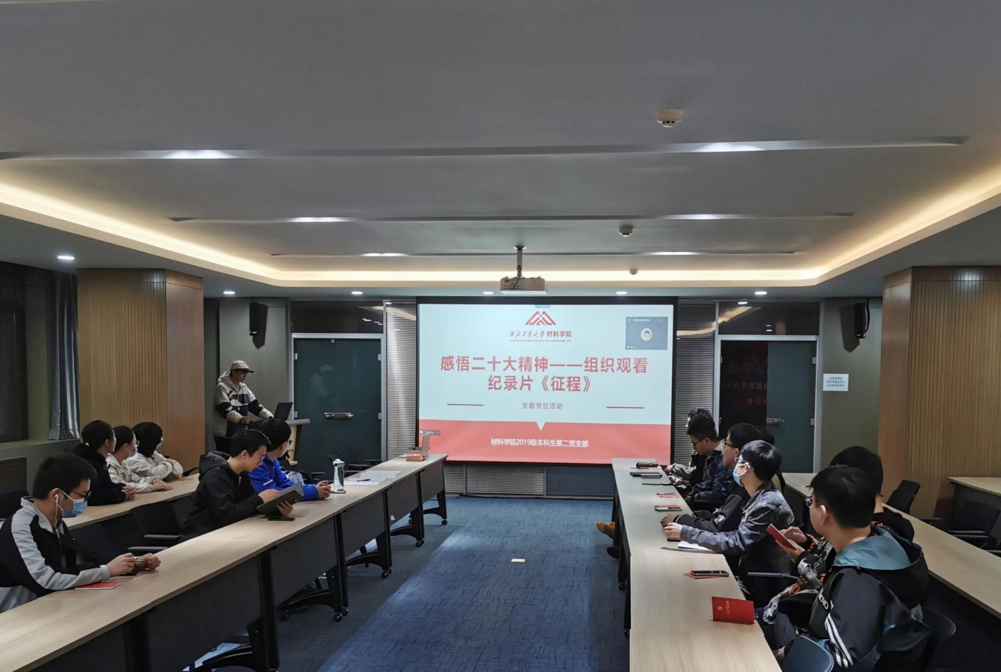 为加强党员对党的二十大精神的全面、深入学习,yl8858永利集团2019级本科生第二党支部于11月13日晚在研究生东馆411会议室召开了“感悟党的二十大精神——组织观看纪录片《征程》”主题党日活动,党支部书记贺亦柏、党支部全体党员以“线上+线下”的形式参加活动,支部副书记吴昊泽主持活动。