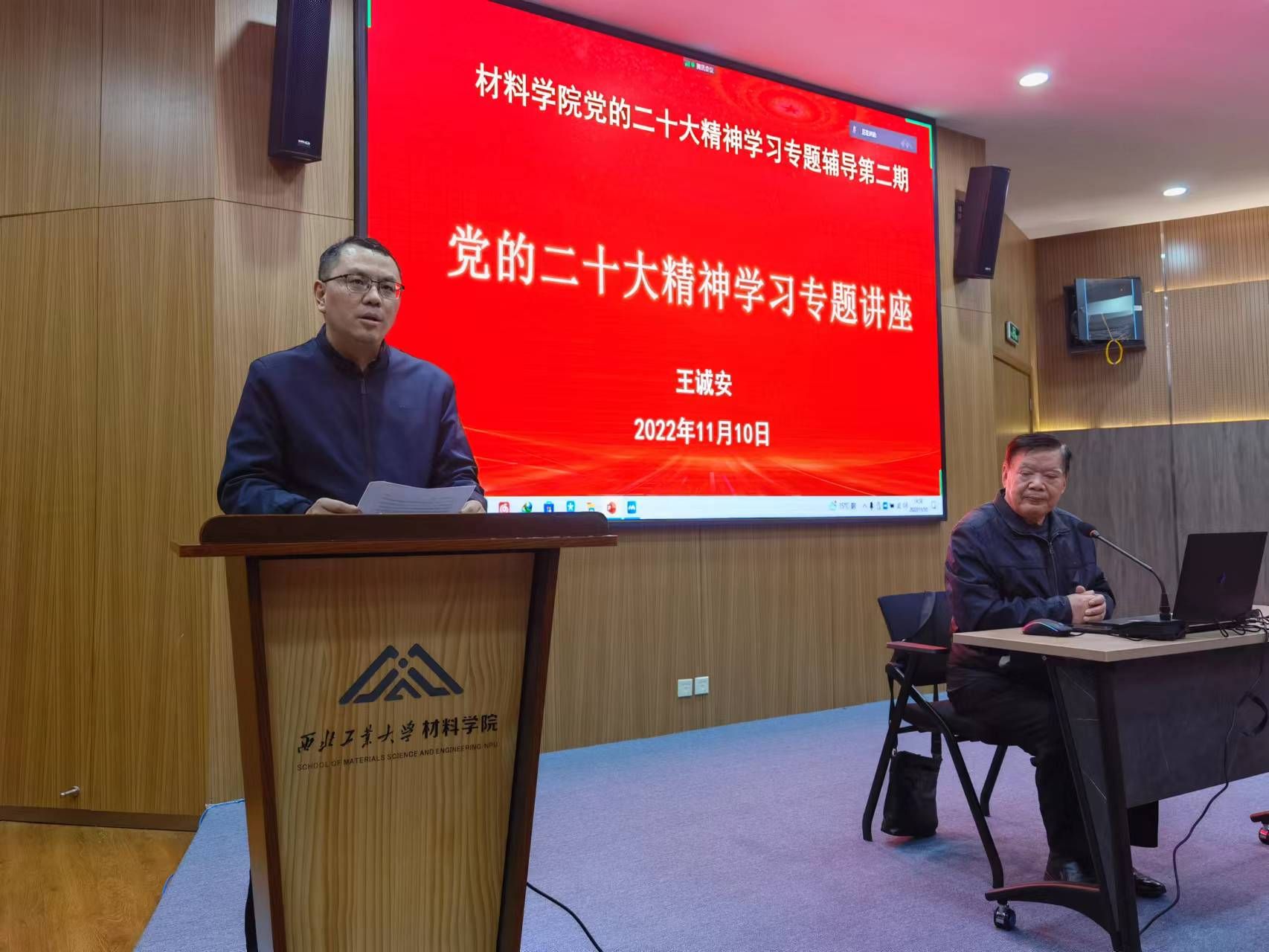 11月10日下午,yl8858永利集团举办“大材良治”——党的二十大精神学习专题辅导讲座第二期,本次活动由锻压第一、第二研究生党支部承办。学院邀请省委党校王诚安教授讲授“党的二十大精神学习解读”,学院党委理论学习中心组成员、机关党支部党员、锻压第一和第二研究生党支部党员聆听了本次讲座。yl8858永利集团党委副书记蔡利剑主持,党委副书记(主持工作)李恒介绍了王诚安教授学术简介。