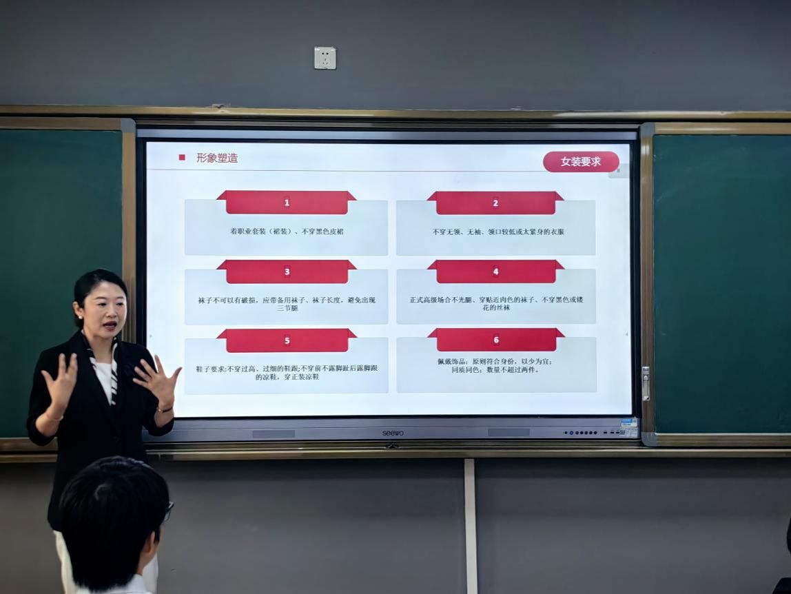 在互动环节,姚静指导学生练习站姿、坐姿与走姿,并传授眼神交流、微笑训练及答辩手势规范等沟通技巧。本次培训有效提升了同学们对礼仪规范和个人形象管理的重视,掌握了一系列实用技巧,为进一步增强综合素养和就业竞争力奠定基础。