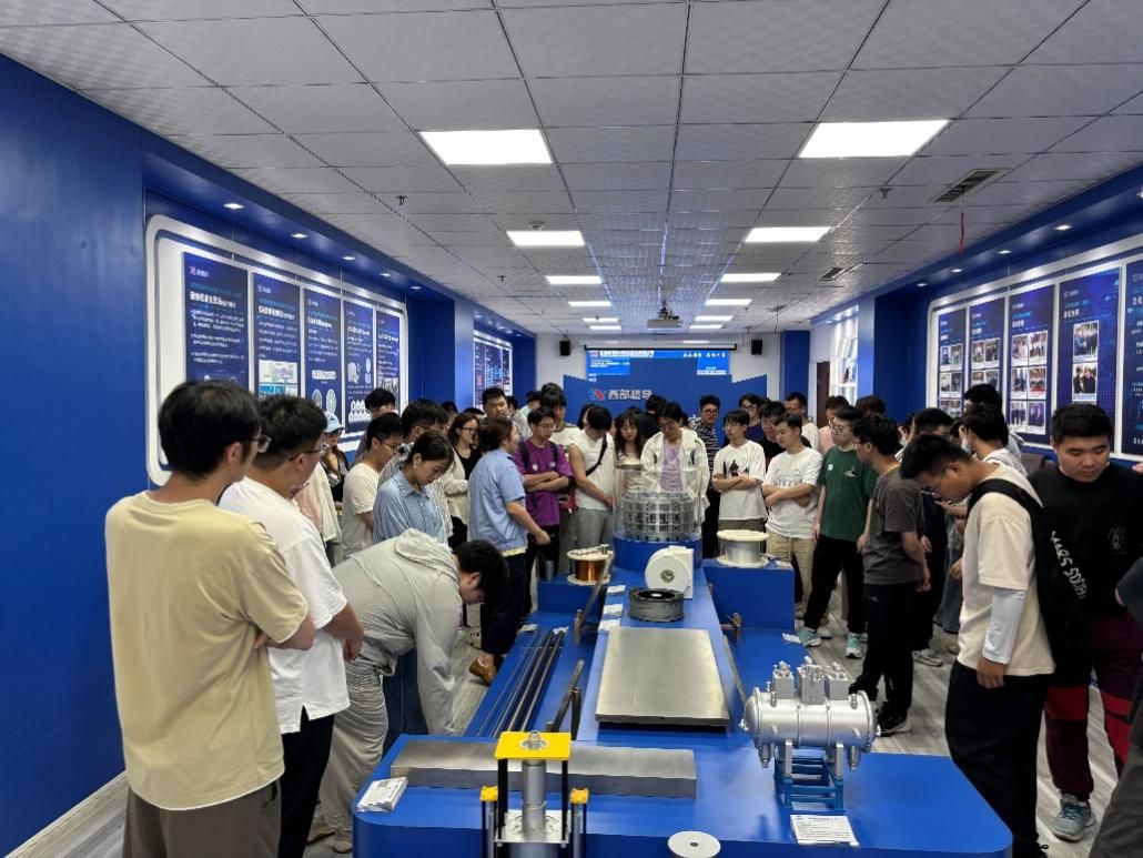 实践队参观了西部超导文化展览室,通过详实的图文与实物展品,系统了解了企业在突破关键材料“卡脖子”技术中的三大里程碑成就:建成了国内首个铌钛棒、超导线材、超导磁体全流程生产线,实现我国超导线材产业化“零的突破”;自主研发的三种损伤容限型钛合金棒丝材,填补国内空白,广泛应用于国产大飞机、新型战机及舰船装备;突破高性能高温合金工程化关键技术,产品性能达国内先进水平,扭转了航空发动机、燃气轮机核心材料长期依赖进口的被动局面。一条从实验室走向产业化的成功之路跃然眼前,让同学们深受触动。