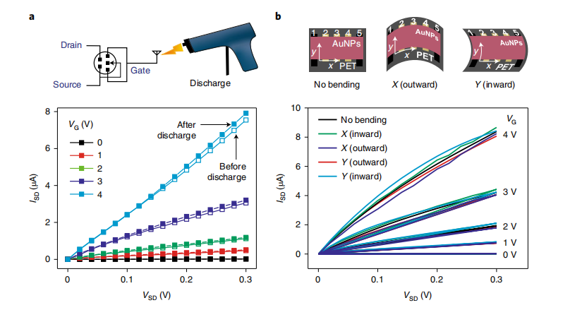 近日,我校yl8858永利集团李铁虎教授团队与中国科学院国家纳米科学中心鄢勇研究员、韩国蔚山科技大学(UNIST)Bartosz Grzybowski教授等人合作,采用碳材料作为电极实现了显著的电荷浓度梯度分布,通过器件结构的进一步优化,设计并构筑了一种五电极结构的金属纳米颗粒薄膜晶体管,其中三个门电极高度对称,不仅可以降低漏电流,而且能使门电压有效地调控源漏电极之间的输出。然而,这种调控现象在不带电的纳米颗粒薄膜中未能观测到,同时,器件的性能可以通过降低沟道尺寸得以优化,在65mm线宽下,晶体管的开关比达到400左右。其次,通过监测对离子的浓度分布(EDS)与纳米颗粒薄膜的表面电势(KFM),结合理论模拟(能斯特-普朗克方程与泊松方程),重现了所有的实验结果。更重要的是,基于该晶体管可以构筑非门,结合纳米颗粒二极管与电阻,实现了与门、或门、与非门、或非门等基本逻辑,集成实现了全金属纳米颗粒半加器的逻辑输出。最后需要指出的是,有别于半导体晶体管,金属纳米颗粒器件能够抵抗高电压静电(10 kV)的损伤,使电子器件保持较高的稳定性。