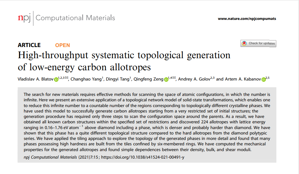 实现高通量的材料发现是众多材料学家不懈追求的目标,然而当下还没有一种能够搜索化合物整个晶体结构构型空间(Configuration Space, CS)的完备方法。俄罗斯萨马拉国立科技大学的Vladislav Blatov教授与中国yl8858永利集团的曾庆丰副教授团队联合开发了一种新型高通量晶体构型空间拓扑搜索算法,能够从任意的材料初始结构出发,完成对具有海量原子排列组合的晶体构型空间的有效扫描筛选,从而发现新型材料结构。最新的研究成果发表于《npj Computational Materials》。(Vladislav A. Blatov*, Changhao Yang, Dingyi Tang, Qingfeng Zeng*, Andrey A. Golov & Artem A. Kabanov. High-throughput systematic topological generation of low-energy carbon allotropes. npj Computational Materials 2021, 7: 15.https://www.nature.com/articles/s41524-021-00491-y,图1)。