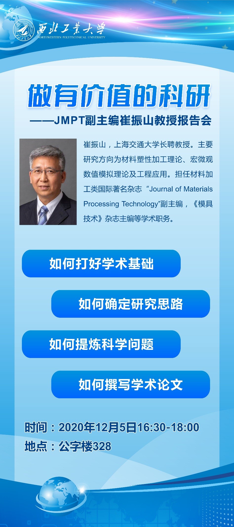 报告人简介:崔振山,上海交通大学长聘教授。主要研究方向为材料塑性加工理论、宏微观数值模拟理论及工程应用。担任材料加工类国际著名杂志“Journal of Materials Processing Technology”副主编,《模具技术》杂志主编等学术职务。