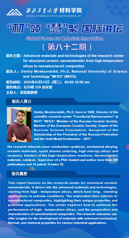 报告主题:1、Advanced materials and technologies of the research center for structural ceramic nanomaterials: from high-temperature alloys to nanostructured composites 2、Development of high-entropy ceramic materials based on refractory carbides (TaTiNbZr)C and (TaTiNbZrX)C (X=Hf, W, Mo) by SHS and spark plasma sintering