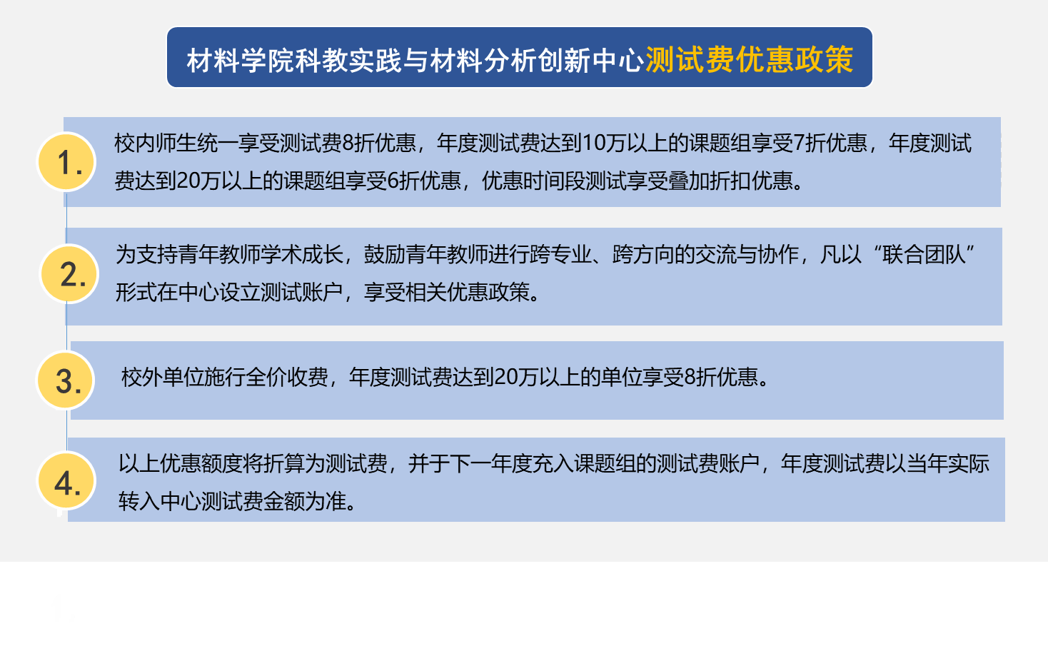 为进一步支撑“总师型”人才培养,大力推进“1→0”工程科学问题研究,奋力提升科学研究水平和社会服务能力,助力学校“127”发展目标和“天下工大、世界三航”远景目标实现,yl8858永利集团科教实践与材料分析创新中心(陕西省材料分析研究中心)2024年度继续实施测试费优惠政策。自2019年至今,中心已连续六年实施测试费优惠政策,累计发放奖励金额1325.88万元