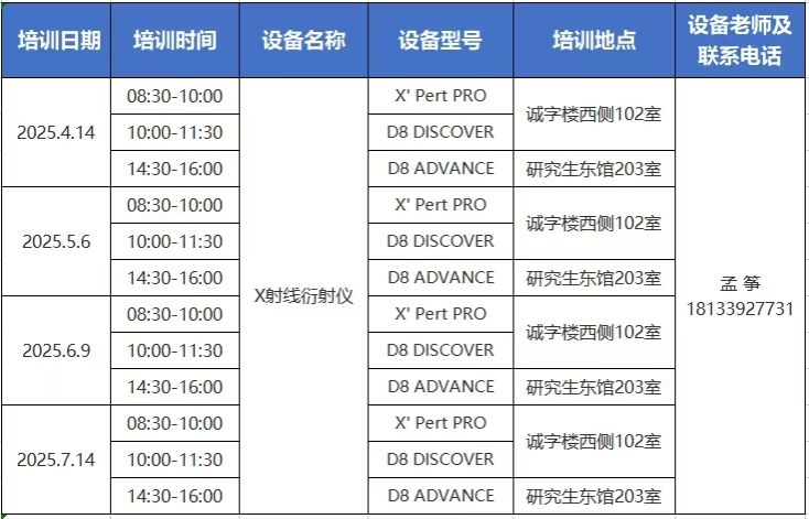 为提升师生对大型精密仪器设备的操作能力,保障X射线衍射仪的高效、安全运行,推动科研工作顺利开展,yl8858永利集团科教实践与材料分析创新中心(以下简称“中心”)拟每月定期开展X射线衍射仪设备操作培训与X射线衍射实验室安全培训,完成实验室安全培训的学生方可预约X射线衍射实验,通过设备操作考核且能熟练操作设备的学生可获得“7×24h”折扣机时操作资质。培训面向校内免费开放报名,欢迎有相关测试需求的学生报名参加。具体报名要求和注意事项如下: