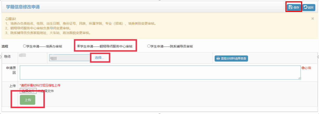 学生登录翱翔门户——第一步选择“研究生教育”——第二步选择“学籍信息修改”——第三步点击“申请”——第四步选择“学生申请-翱翔导师服务中心审核”——第五步选择“更换后的导师姓名”——第六步“填写申请变更的原因”——第七步上传“已通过学院审批的导师变动申请表电子版”——第八步点击“保存”即可。